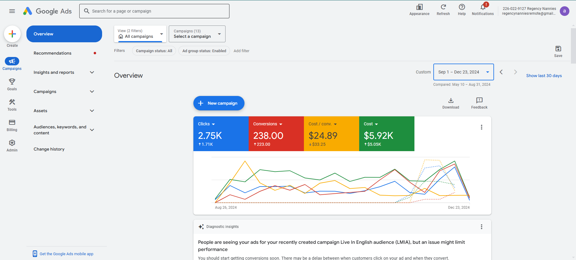 Grâce à une optimisation stratégique de leurs campagnes publicitaires, j'ai aidé Regency Nannies à réduire significativement leur coût par conversion, tout en augmentant le nombre de clics et de conversions globales. En ciblant les bonnes audiences et en ajustant les messages publicitaires, nous avons maximisé l'efficacité de leur budget marketing. Ces améliorations ont entraîné une croissance notable de leurs revenus, renforçant ainsi leur rentabilité et leur succès commercial.